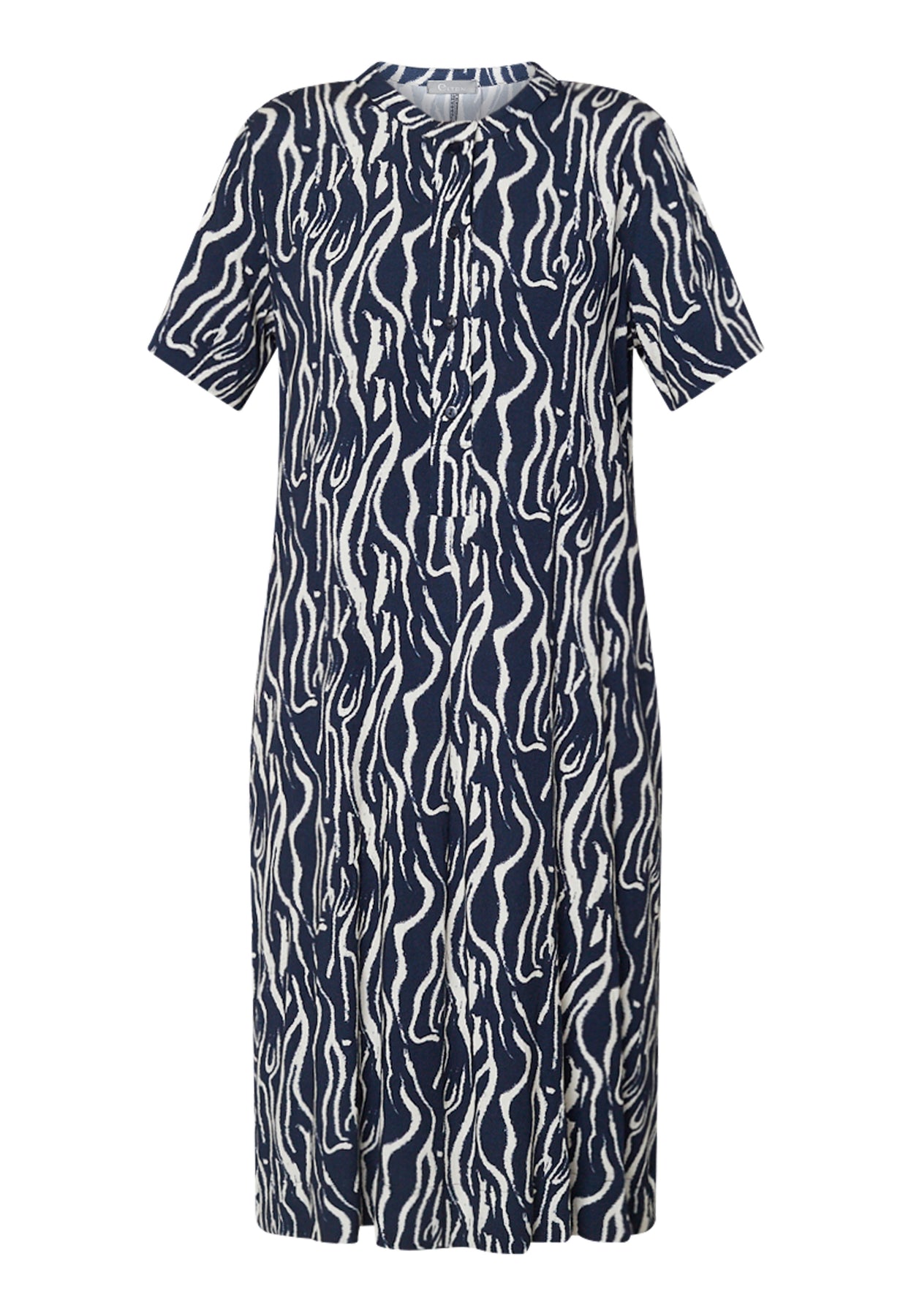 Denne kjole fra Elton kombinerer et raffineret print med en elegant A-formet silhuet, der falder smukt og let omkring kroppen. Det detaljerede mønster tilfører kjolen dybde og et eksklusivt udtryk, mens den bløde viskosekvalitet med let stræk sikrer en behagelig pasform og flot bevægelse. En feminin og velafbalanceret style med et tidløst udtryk.