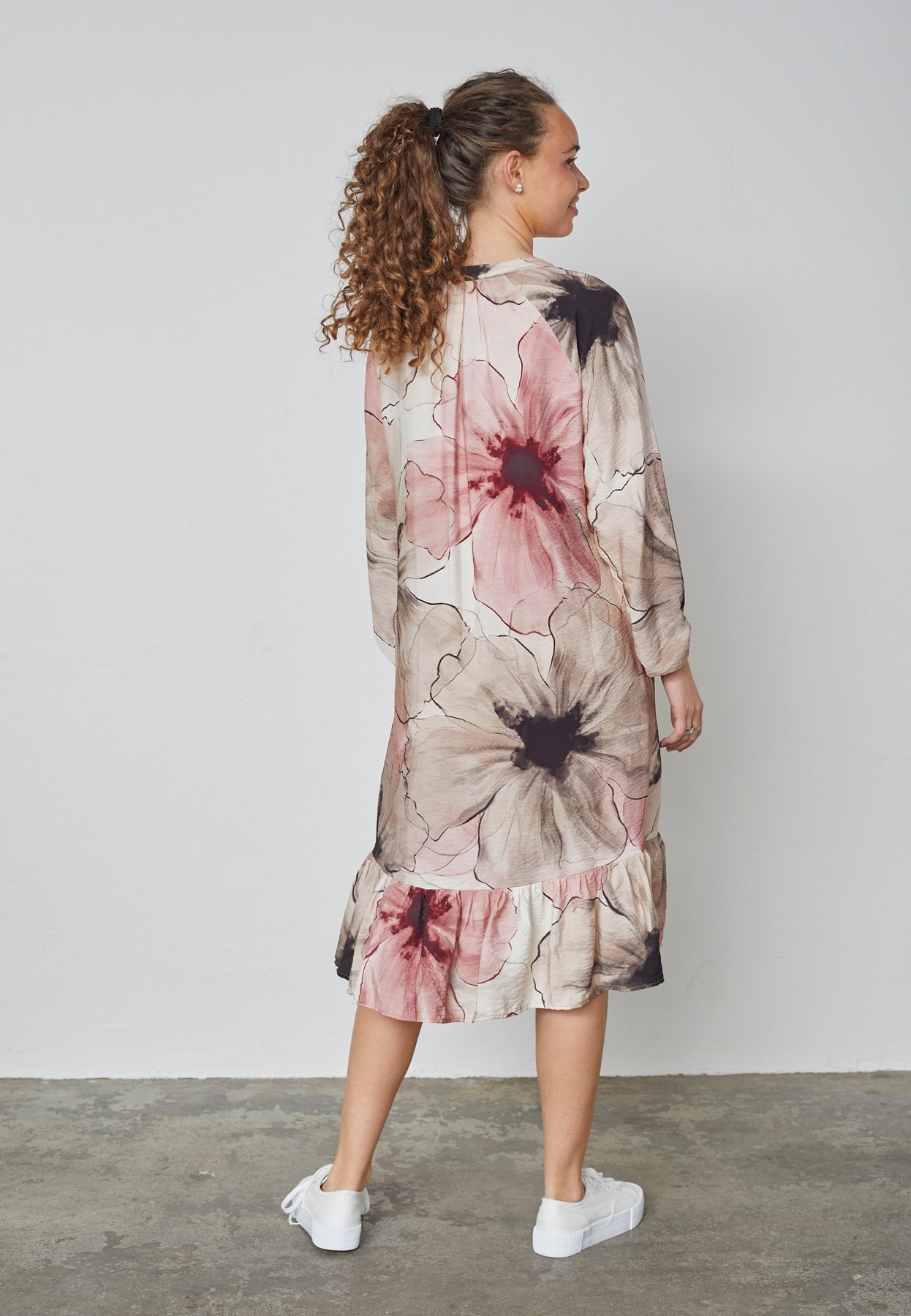 Denne kjole fra Elton har et feminint og levende udtryk, hvor det dekorative print giver kjolen et let og elegant spil. Den bløde viskosekvalitet falder smukt og føles behagelig mod huden, mens det lige snit skaber en afslappet silhuet med et roligt og harmonisk udtryk. En kjole, der kombinerer visuel lethed med komfort i hverdagen.