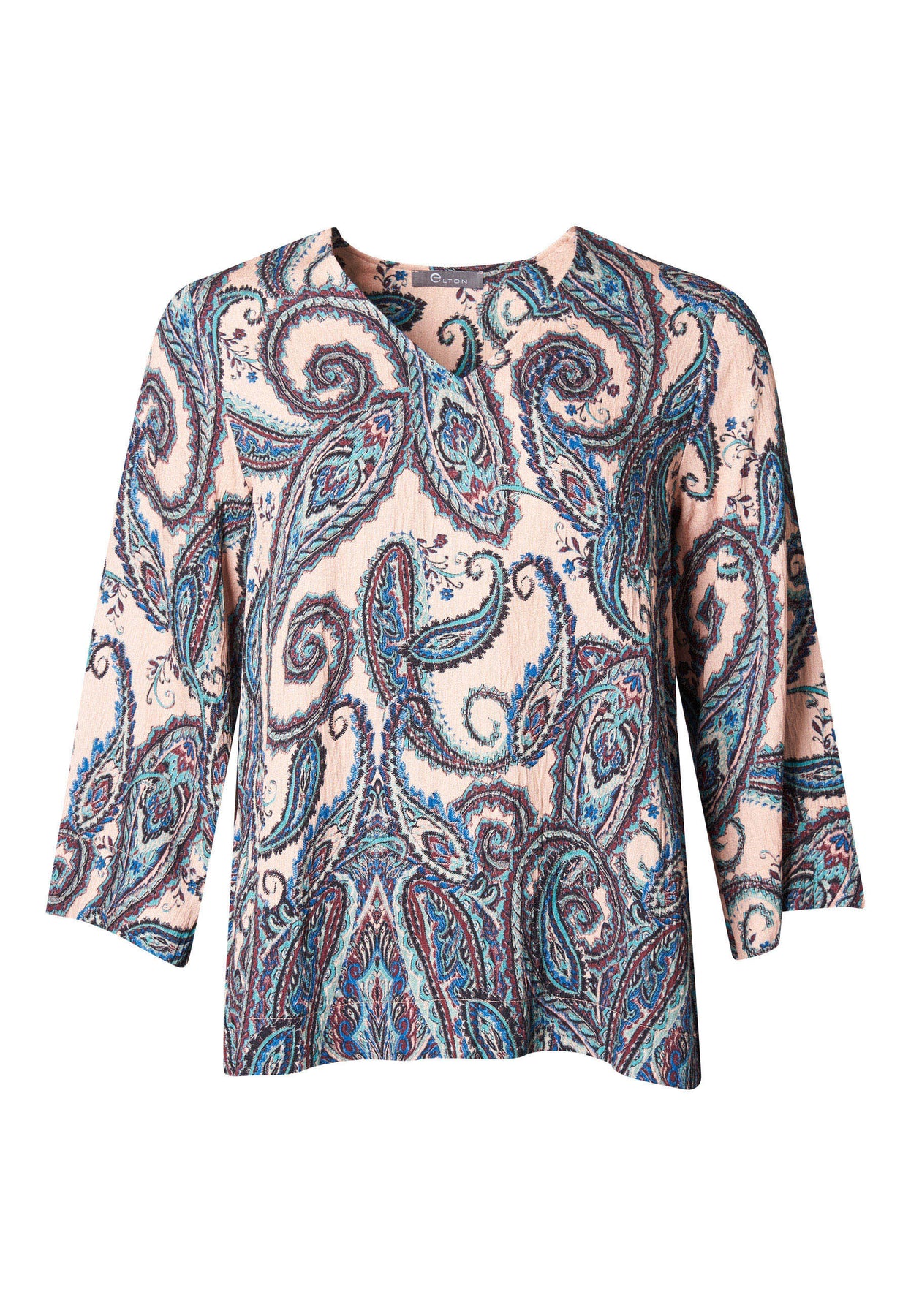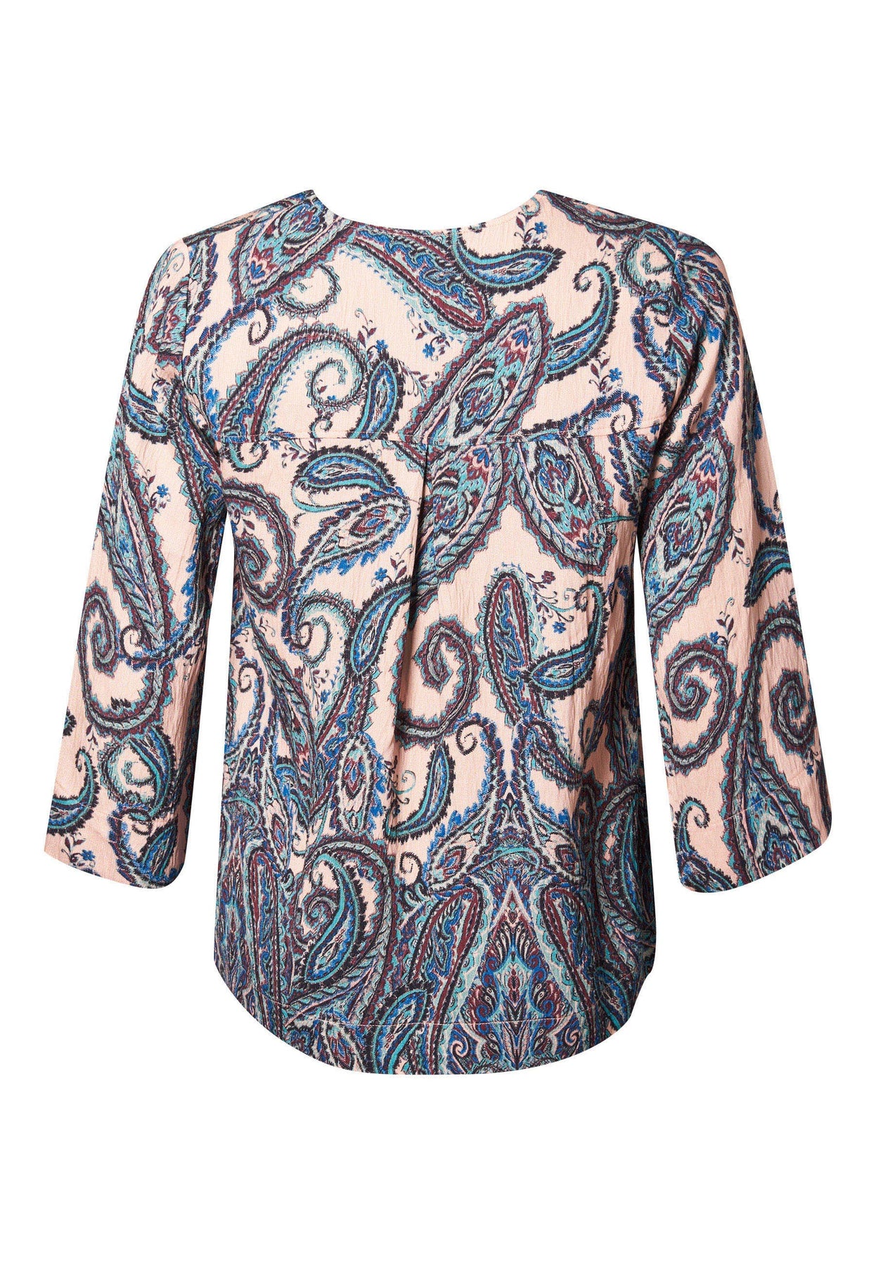 En blød og alsidig bluse med lige snit og et smukt paisleyprint i harmoniske farver. Den lette viskoseblanding føles behagelig mod huden, mens nylonindholdet tilføjer ekstra holdbarhed. Med 3/4-ærmer og rund hals er blusen både komfortabel og nem at style til enhver lejlighed.